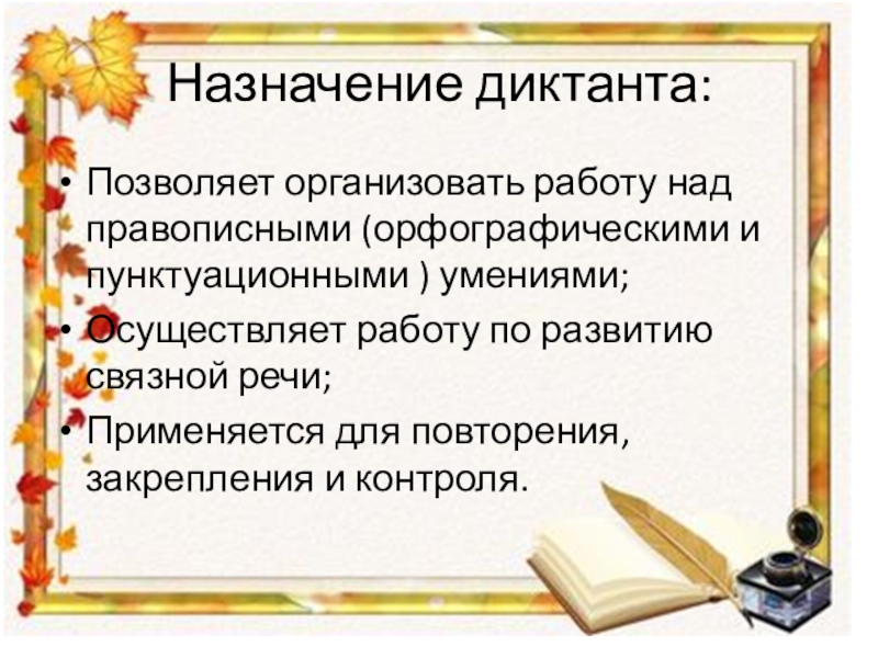 Назначение диктанта: Позволяет организовать работу над правописными (орфографическими и пунктуационными ) умениями; Осуществляет работу по развитию связной