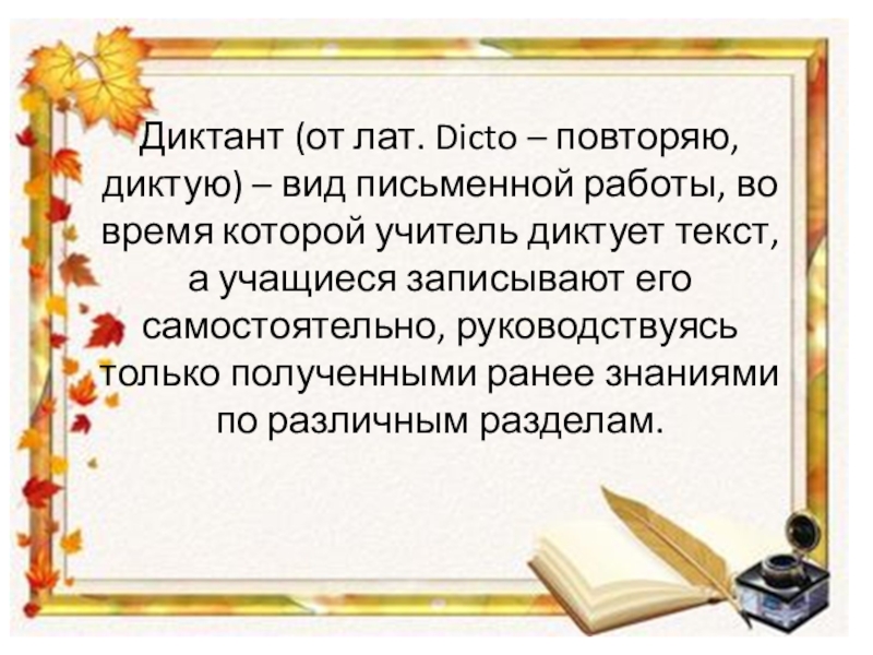 Диктант (от лат. Dicto – повторяю, диктую) – вид письменной работы, во время которой учитель диктует текст, а учащиеся записывают его самостоятельно, руководствуясь только полученными ранее знаниями по различным разделам.