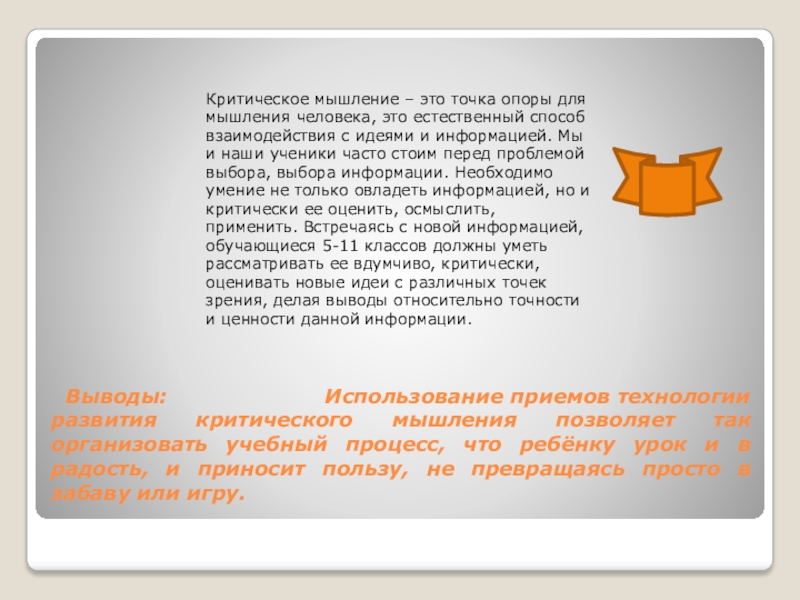 Критическое мышление – это точка опоры для мышления человека, это естественный способ взаимодействия с идеями и информацией. Мы и наши ученики часто стоим перед проблемой выбора, выбора информации. Необходимо умение не только овладеть информацией, но и критически ее оценить, осмыслить, применить. Встречаясь с новой информацией, обучающиеся 5-11 классов должны уметь рассматривать ее вдумчиво, критически, оценивать новые идеи с различных точек зрения, делая выводы относительно точности и ценности данной информации.
