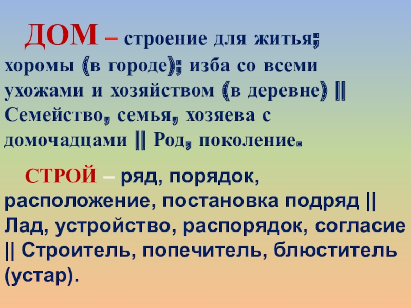 СТРОЙ – ряд, порядок, расположение, постановка подряд || Лад, устройство, распорядок, согласие || Строитель, попечитель, блюститель (устар).