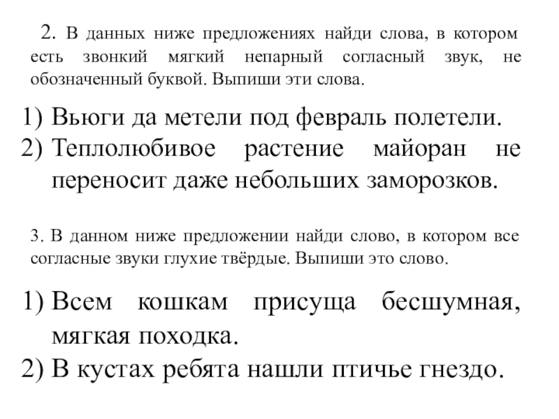 2. В данных ниже предложениях найди слова, в котором есть звонкий мягкий непарный согласный звук, не обозначенный