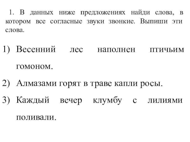 1. В данных ниже предложениях найди слова, в котором все согласные звуки звонкие. Выпиши эти слова. Весенний лес
