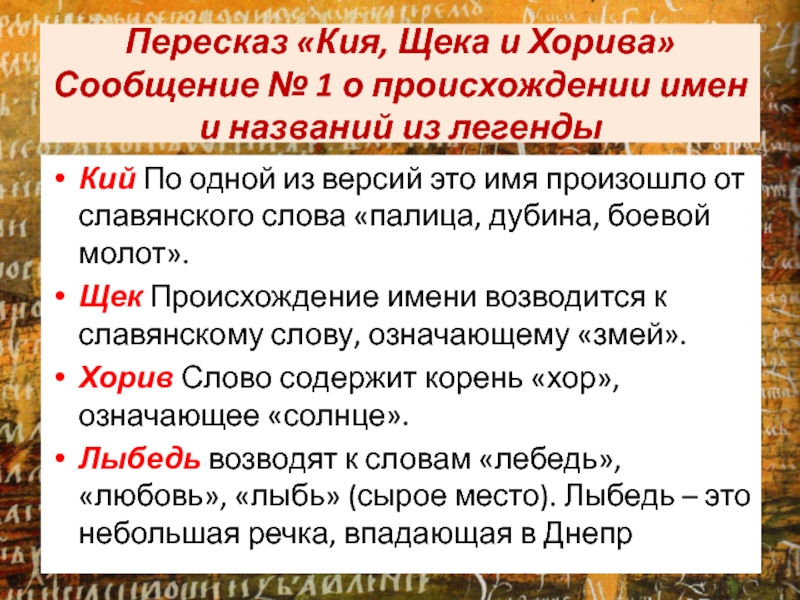 Кий По одной из версий это имя произошло от славянского слова «палица, дубина, боевой молот».