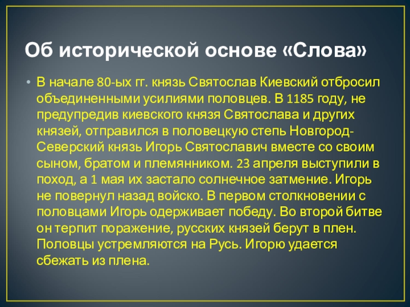объединенными усилиями половцев. В 1185 году, не предупредив киевского князя Святослава и других князей, отправился в половецкую степь Новгород-Северский князь Игорь Святославич вместе со своим сыном, братом и племянником. 23 апреля выступили в поход, а 1 мая их застало солнечное затмение. Игорь не повернул назад войско. В первом столкновении с половцами Игорь одерживает победу. Во второй битве он терпит поражение, русских князей берут в плен. Половцы устремляются на Русь. Игорю удается сбежать из плена.