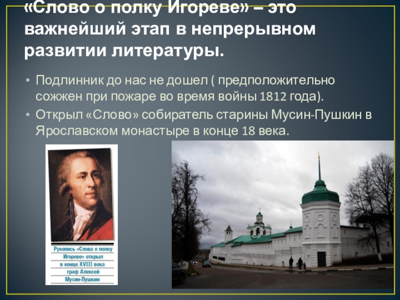 Открыл «Слово» собиратель старины Мусин-Пушкин в Ярославском монастыре в конце 18 века.