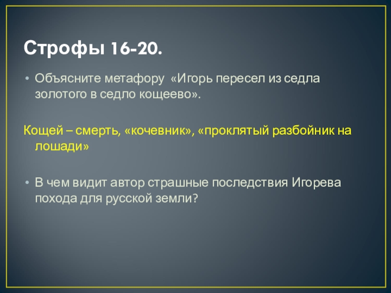 Объясните метафору «Игорь пересел из седла золотого в седло кощеево».