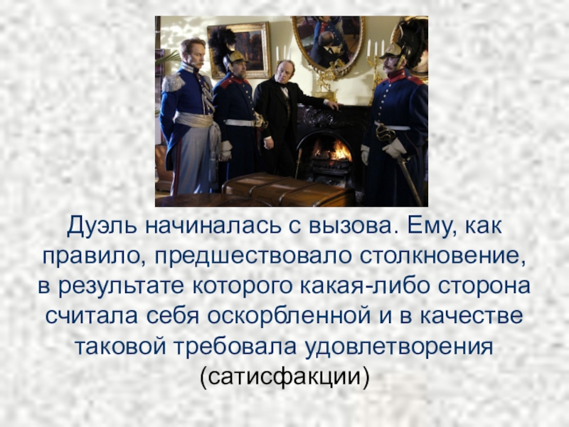 Слайд 8 Дуэль начиналась с вызова. Ему, как правило, предшествовало столкновение, в результате