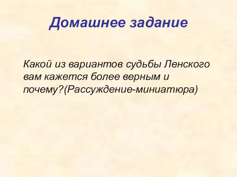 Домашнее задание   Какой из вариантов судьбы Ленского вам кажется более верным и почему?(Рассуждение-миниатюра)