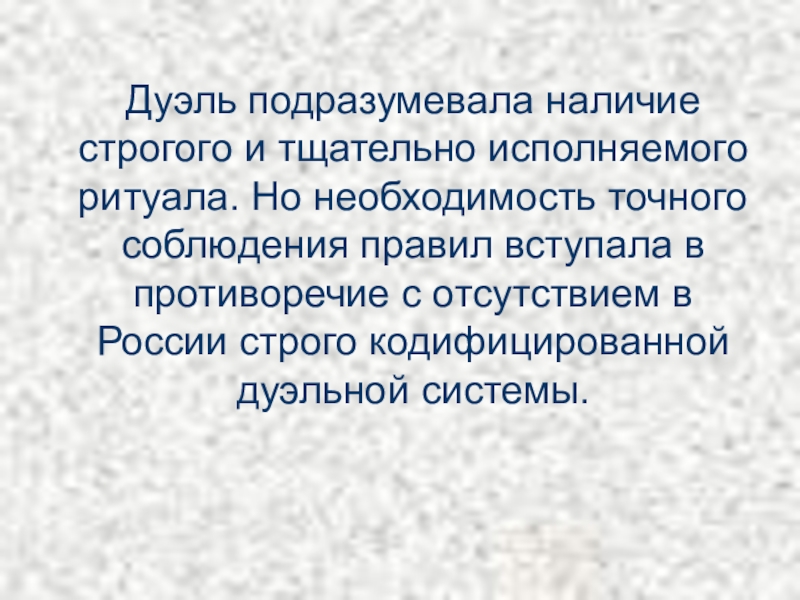 Слайд 5 Дуэль подразумевала наличие строгого и тщательно исполняемого ритуала. Но необходимость точного