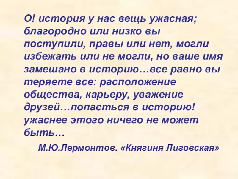 вы поступили, правы или нет, могли избежать или не могли, но ваше имя замешано в историю…все равно вы теряете все: расположение общества, карьеру, уважение друзей…попасться в историю! ужаснее этого ничего не может быть…