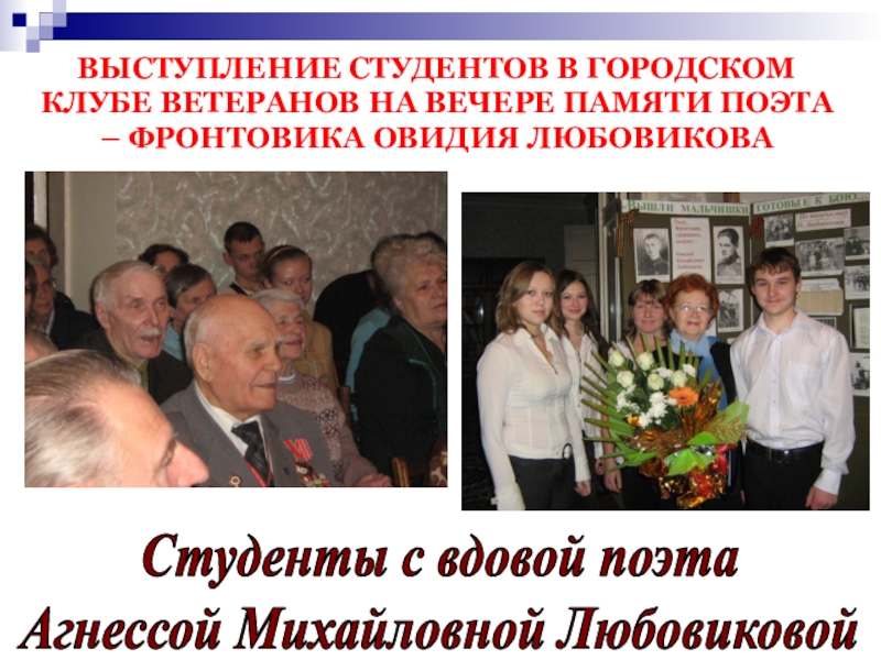 Слайд 30ВЫСТУПЛЕНИЕ СТУДЕНТОВ В ГОРОДСКОМ КЛУБЕ ВЕТЕРАНОВ НА ВЕЧЕРЕ ПАМЯТИ ПОЭТА –