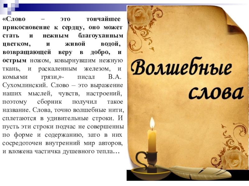 нежным благоуханным цветком, и живой водой, возвращающей веру в добро, и острым ножом, ковырнувшим нежную ткань, и раскаленным железом, и комьями грязи,»- писал В.А. Сухомлинский. Слово – это выражение наших мыслей, чувств, настроений, поэтому сборник получил такое название. Слова, точно волшебные нити, сплетаются в удивительные строки. И пусть эти строки подчас не совершенны по форме и содержанию, зато в них сосредоточен внутренний мир авторов, и вложена частичка душевного тепла…