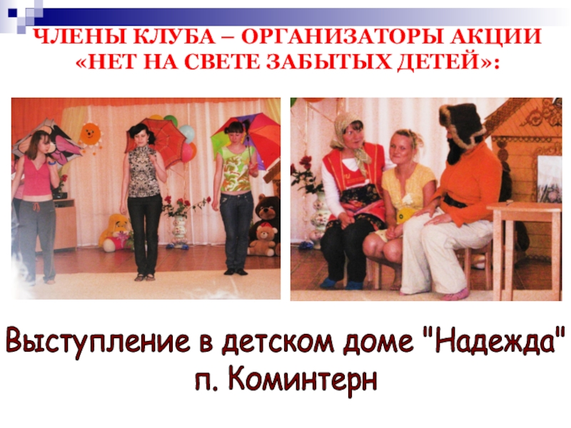 Слайд 22ЧЛЕНЫ КЛУБА – ОРГАНИЗАТОРЫ АКЦИИ «НЕТ НА СВЕТЕ ЗАБЫТЫХ ДЕТЕЙ»: