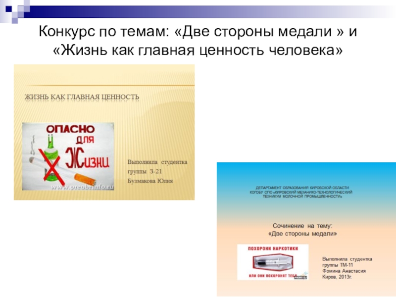 Слайд 27Конкурс по темам: «Две стороны медали » и «Жизнь как главная