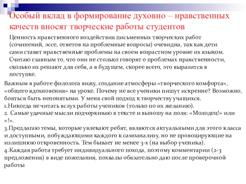 Ценность нравственного воздействия письменных творческих работ (сочинений, эссе, ответов на проблемные вопросы) очевидна, так как дети сами ставят нравственные проблемы на своем возрастном уровне их языком. Считаю главным то, что они не столько говорят о проблемах нравственности, сколько их решают для себя, а в будущем, скорее всего, это выразится в поступке.