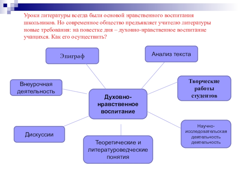 школьников. Но современное общество предъявляет учителю литературы новые требования: на повестке дня – духовно-нравственное воспитание учащихся. Как его осуществить?