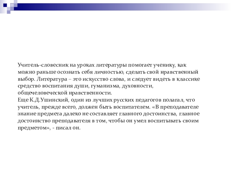 Еще К.Д.Ушинский, один из лучших русских педагогов полагал, что учитель, прежде всего, должен быть воспитателем. «В преподавателе знание предмета далеко не составляет главного достоинства, главное достоинство преподавателя в том, чтобы он умел воспитывать своим предметом», - писал он.