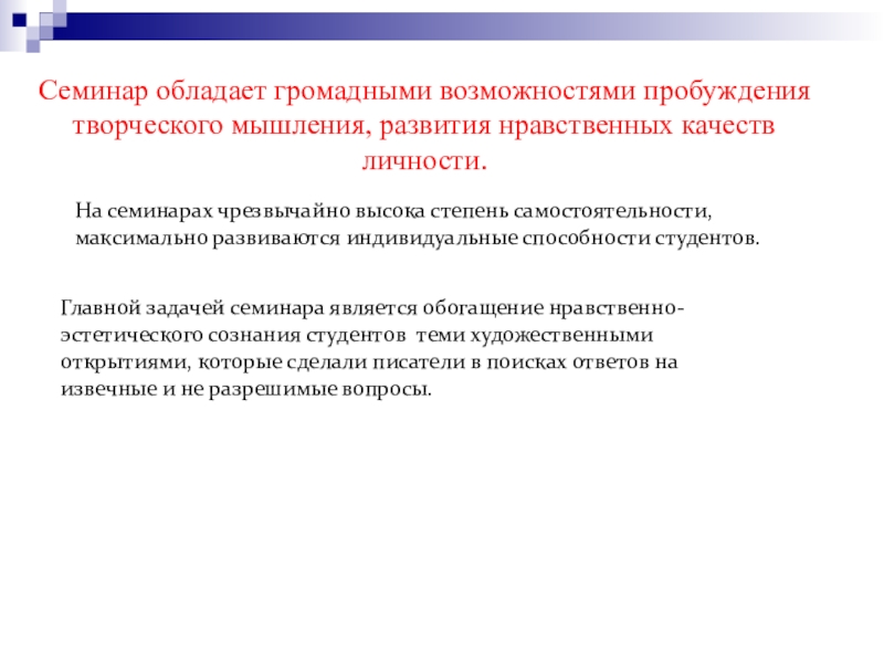 Слайд 13Семинар обладает громадными возможностями пробуждения творческого мышления, развития нравственных качеств личности.
