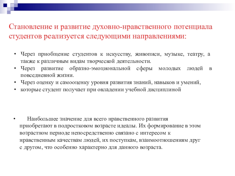 Становление и развитие духовно-нравственного потенциала студентов реализуется следующими направлениями: