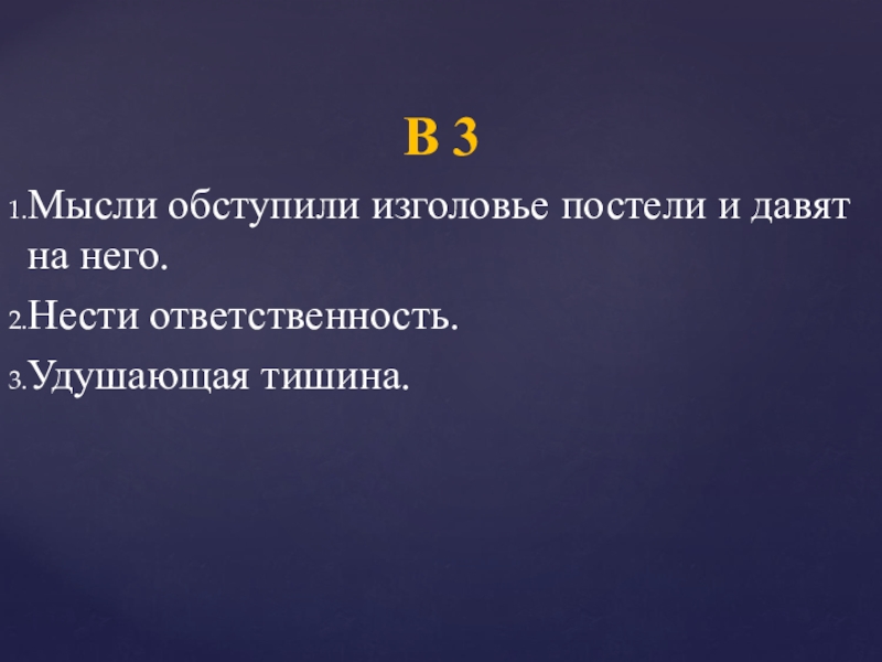 В 3Мысли обступили изголовье постели и давят на него.Нести ответственность.Удушающая тишина.
