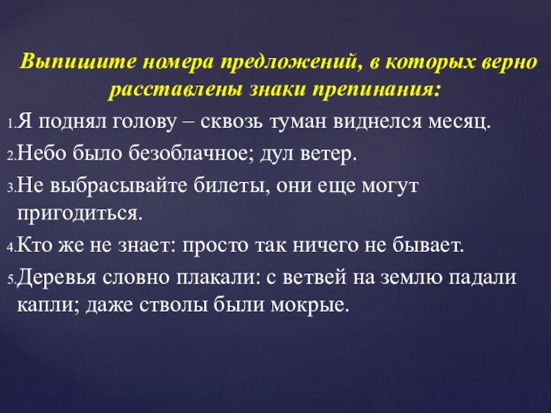 Выпишите номера предложений, в которых верно расставлены знаки препинания:Я поднял голову – сквозь туман виднелся месяц.Небо было
