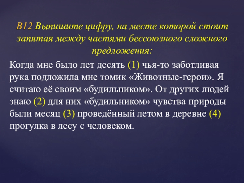 В12 Выпишите цифру, на месте которой стоит запятая между частями бессоюзного сложного предложения:Когда мне было лет десять (1) чья-то заботливая рука подложила мне томик «Животные-герои». Я считаю её своим «будильником». От других людей знаю (2) для