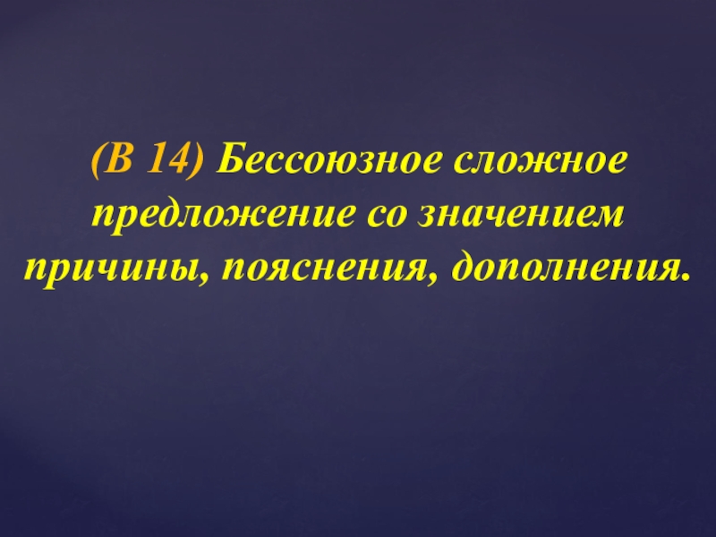 Слайд 1(В 14) Бессоюзное сложное предложение со значением причины, пояснения, дополнения.