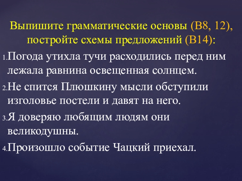 Слайд 4Выпишите грамматические основы (В8, 12), постройте схемы предложений (В14):