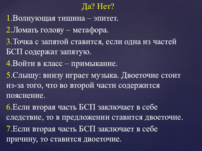 Да? Нет?1.Волнующая тишина – эпитет.2.Ломать голову – метафора.3.Точка с запятой ставится, если одна из частей БСП содержат