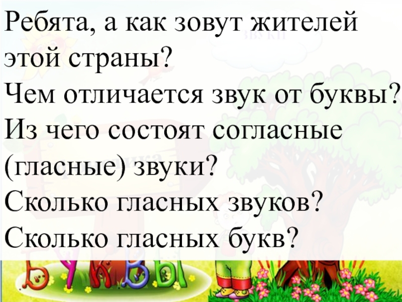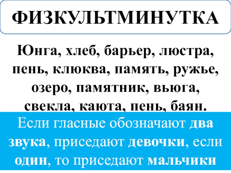 Если гласные обозначают два звука, приседают девочки, если один, то приседают мальчики