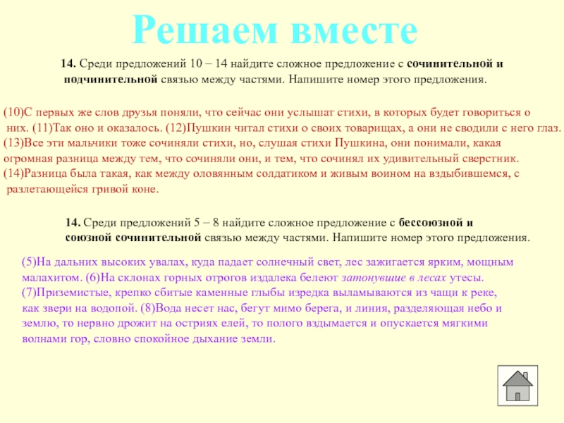 14. Среди предложений 10 – 14 найдите сложное предложение с сочинительной и