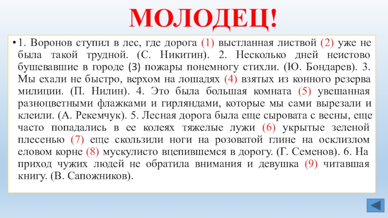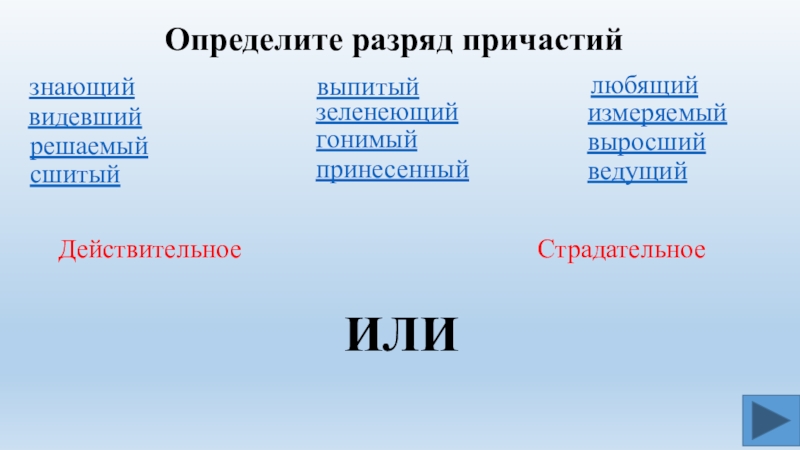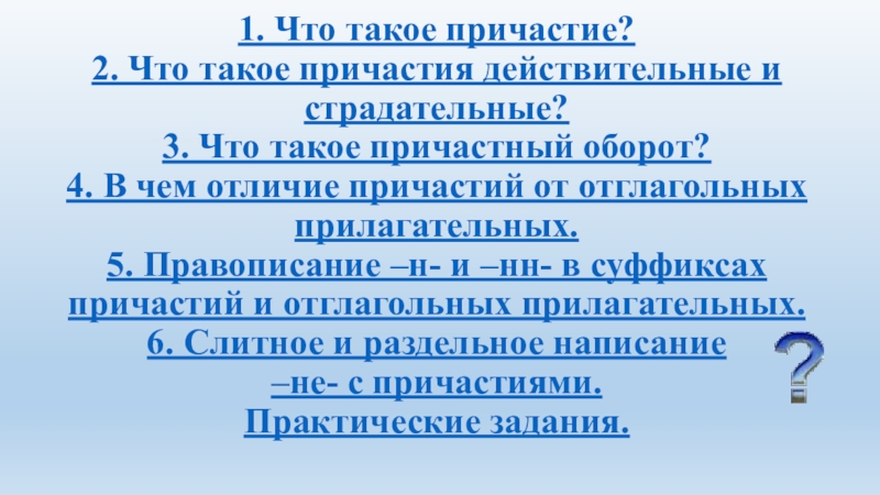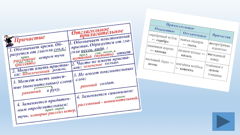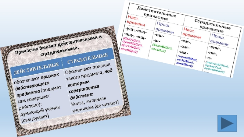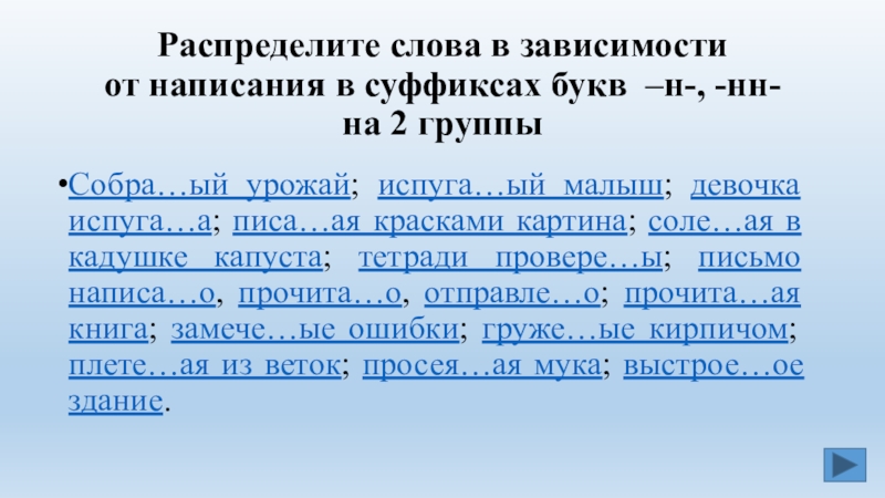 Собра…ый урожай; испуга…ый малыш; девочка испуга…а; писа…ая красками картина; соле…ая в кадушке капуста; тетради провере…ы; письмо написа…о, прочита…о, отправле…о; прочита…ая книга; замече…ые ошибки; груже…ые кирпичом; плете…ая из веток; просея…ая мука; выстрое…ое здание.