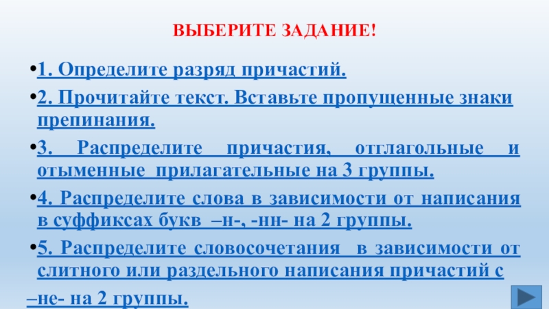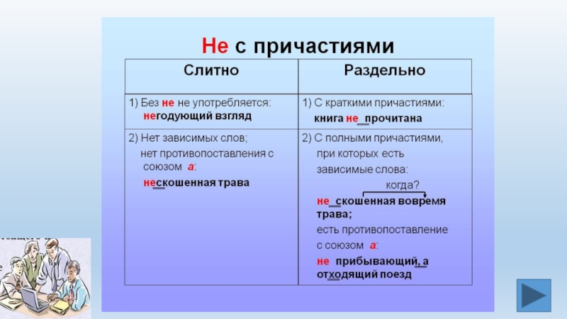 (Не)подготовленная доска, (не)уважающий других, (не)разношенные сапоги, (не)сшитый, а связанный костюм, (не)достижимая цель, (не)годующий учитель, (не)рассказанная на ночь сказка, еще (не)подогретый обед, ничем (не)отмеченный день, (не)нуждающиеся в совете, (не)скошенная трава, напиток (не)допит, правило (не)выучено.