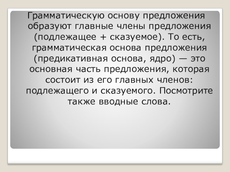 есть, грамматическая основа предложения (предикативная основа, ядро) — это основная часть предложения, которая состоит из его главных членов: подлежащего и сказуемого. Посмотрите также вводные слова.