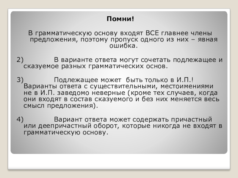 4) Вариант ответа может содержать причастный или деепричастный оборот, которые никогда не входят в грамматическую основу.