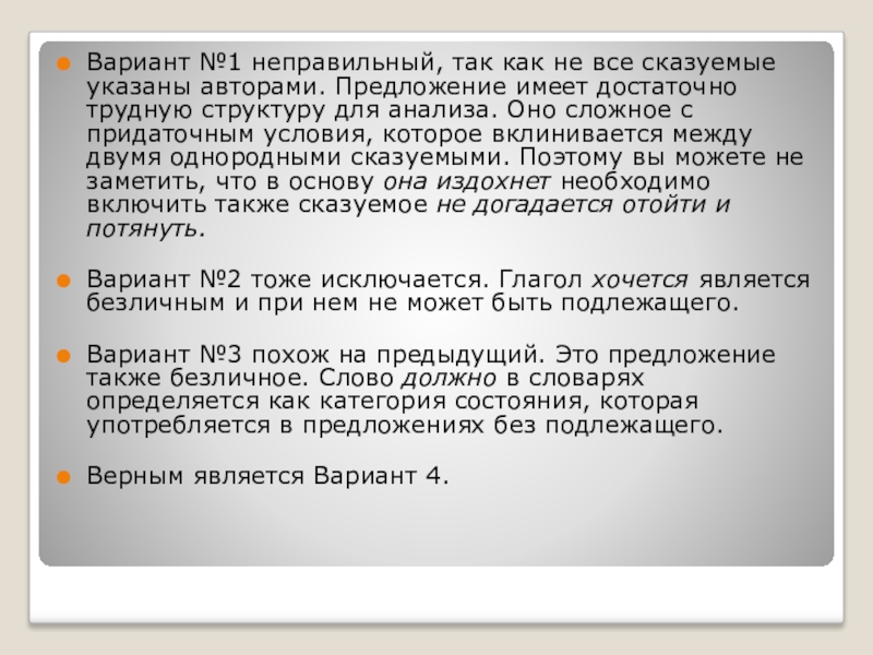 Слайд 23Вариант №1 неправильный, так как не все сказуемые указаны авторами. Предложение