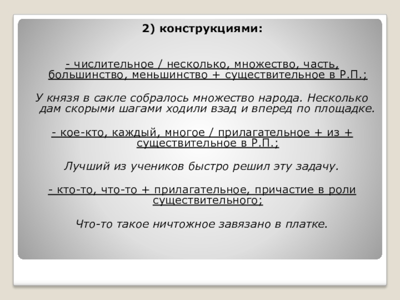 - числительное / несколько, множество, часть, большинство, меньшинство + существительное