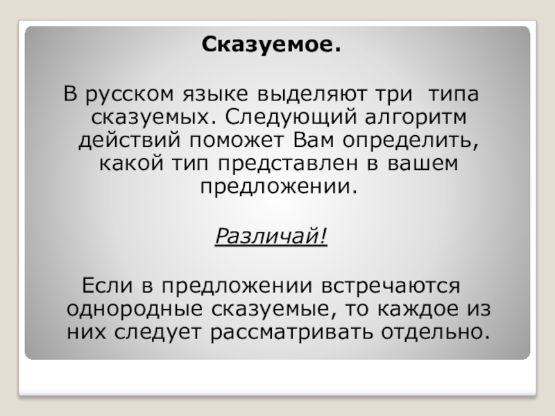 В русском языке выделяют три типа сказуемых. Следующий алгоритм действий поможет