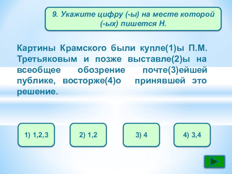 Картины Крамского были купле(1)ы П.М.Третьяковым и позже выставле(2)ы на всеобщее обозрение почте(3)ейшей публике, восторже(4)о принявшей это решение.