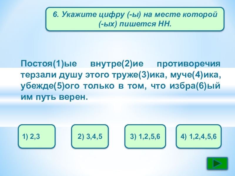 Постоя(1)ые внутре(2)ие противоречия терзали душу этого труже(3)ика, муче(4)ика, убежде(5)ого только в том, что избра(6)ый им путь верен.