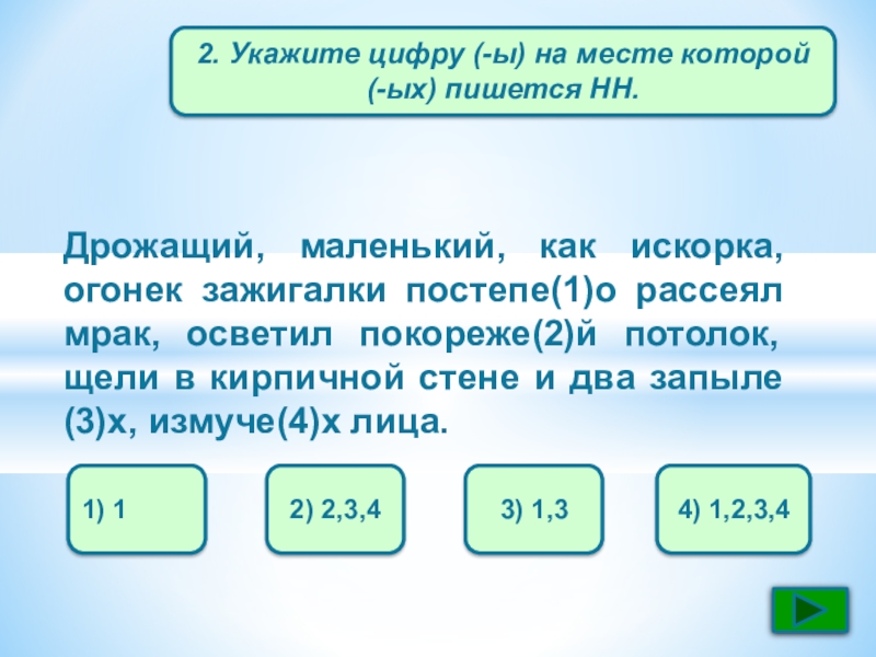 Дрожащий, маленький, как искорка, огонек зажигалки постепе(1)о рассеял мрак, осветил покореже(2)й потолок, щели в кирпичной стене и два запыле(3)х, измуче(4)х лица.
