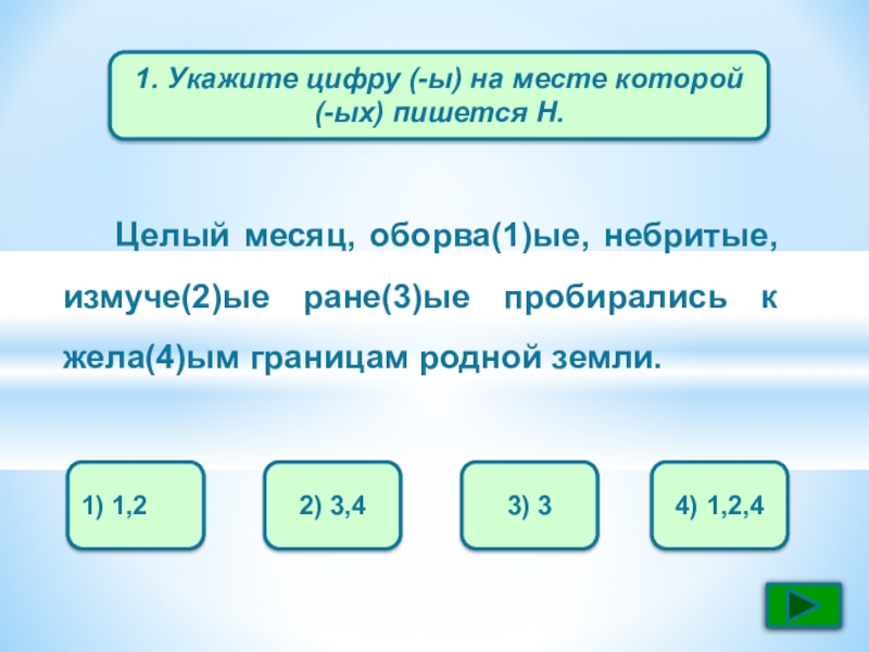 Целый месяц, оборва(1)ые, небритые, измуче(2)ые ране(3)ые пробирались к жела(4)ым границам родной земли.