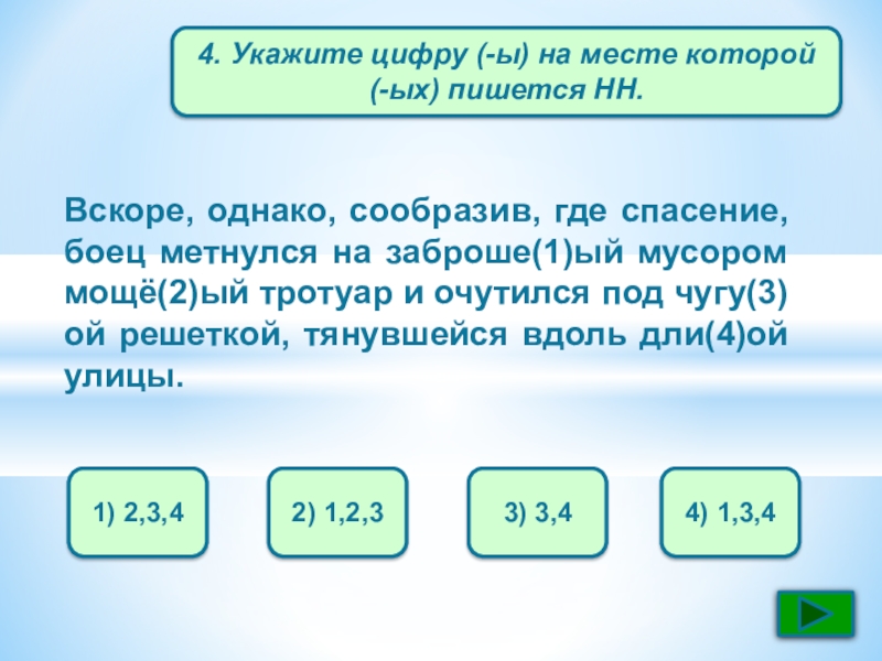 Вскоре, однако, сообразив, где спасение, боец метнулся на заброше(1)ый мусором мощё(2)ый тротуар и очутился под чугу(3)ой решеткой, тянувшейся вдоль дли(4)ой улицы.