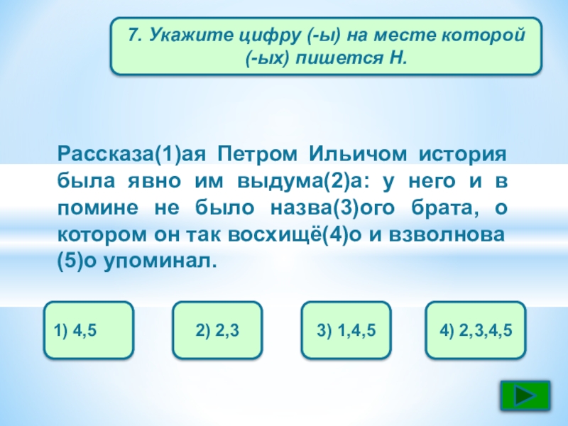 Рассказа(1)ая Петром Ильичом история была явно им выдума(2)а: у него и в помине не было назва(3)ого брата, о котором он так восхищё(4)о и взволнова(5)о упоминал.