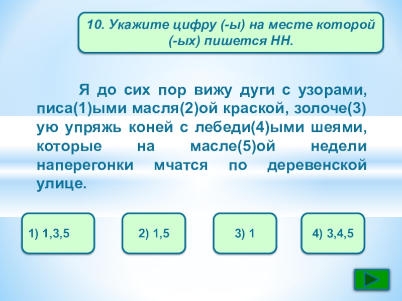 Я до сих пор вижу дуги с узорами, писа(1)ыми масля(2)ой краской, золоче(3)ую упряжь коней с лебеди(4)ыми шеями, которые на масле(5)ой недели наперегонки мчатся по деревенской улице.