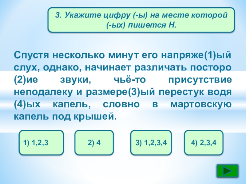 Спустя несколько минут его напряже(1)ый слух, однако, начинает различать посторо(2)ие звуки, чьё-то присутствие неподалеку и размере(3)ый перестук водя(4)ых капель, словно в мартовскую капель под крышей.