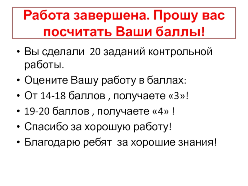 Работа завершена. Прошу вас посчитать Ваши баллы!