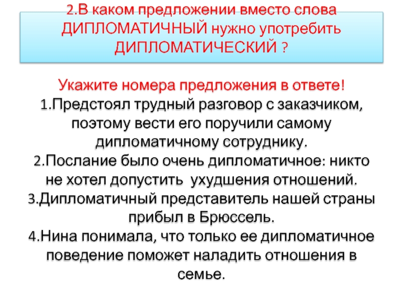 2.В каком предложении вместо слова ДИПЛОМАТИЧНЫЙ нужно употребить ДИПЛОМАТИЧЕСКИЙ ?