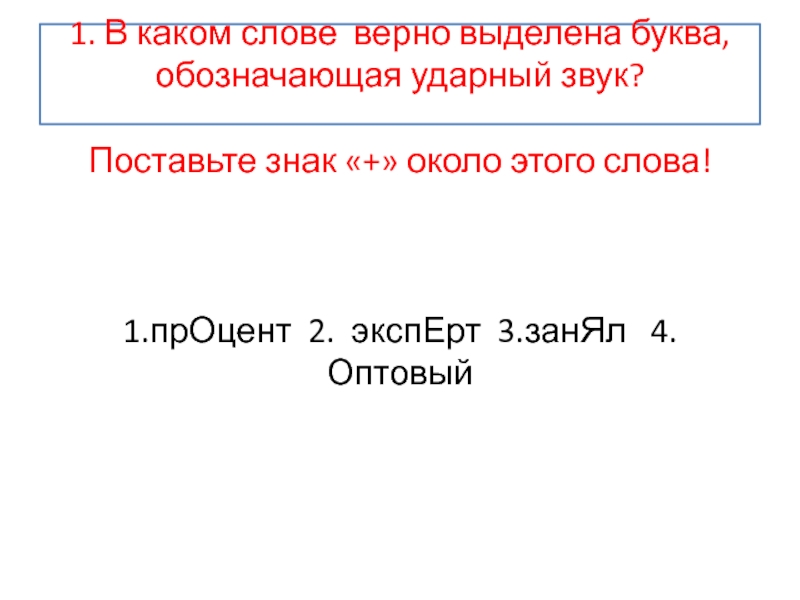 1. В каком слове верно выделена буква, обозначающая ударный звук?