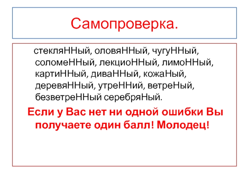 Если у Вас нет ни одной ошибки Вы получаете один балл! Молодец!